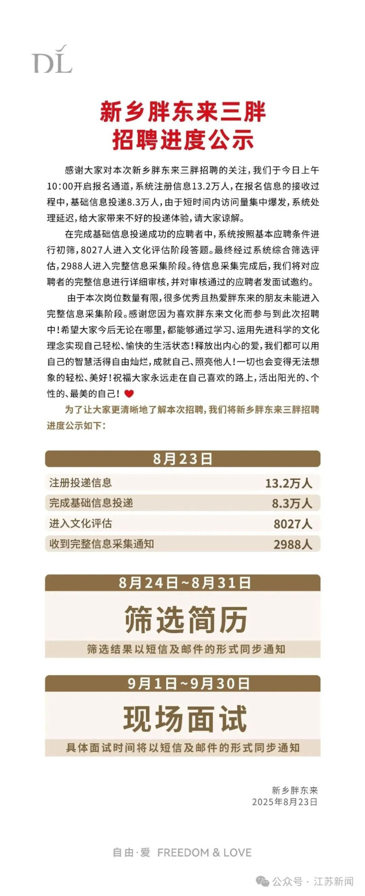 据大河报报道,8月28日,记者从胖东来获悉,新乡胖东来三胖招聘进入面试环节,具体面试时间和地点本月月底前通知到位,据工作人员透露,面试地点“应该是在胖东来新乡大胖店”,由于进入面试人员较多,将分批次面试。8月23日,胖东来官网晒出新乡胖东来三胖招聘进度,最终收到完整信息采集通知的有2988人,面试具体时间为9月1日-9月30日。