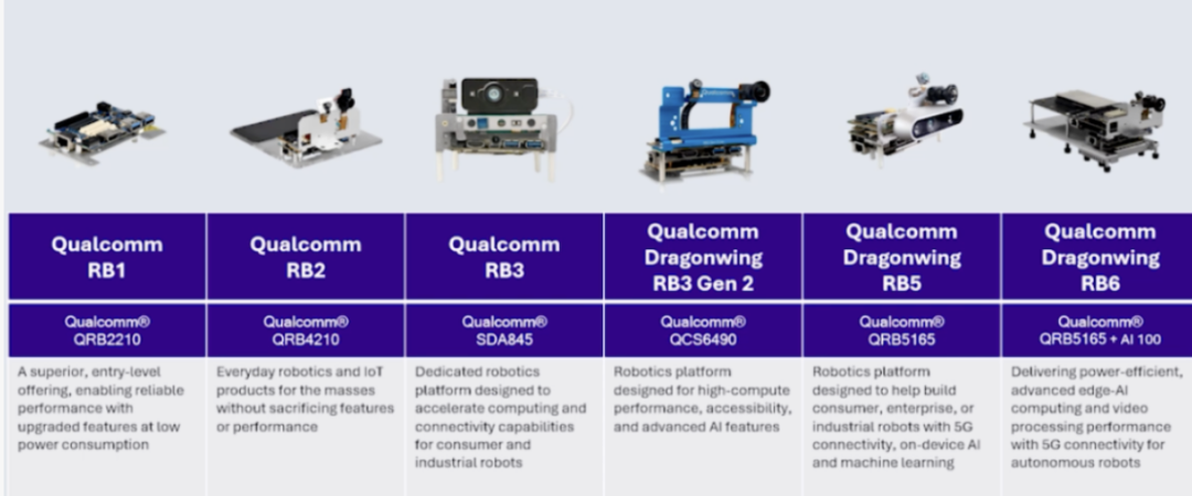 ◎ Qualcomm RB1:基于 Qualcomm QRB2210,是面向入门级市场的产品,能够在低功耗情况下提供可靠性能,可用于对功耗较为敏感且对性能有一定要求的基础机器人产品。QRB2210 处理器配置了四核心 Arm Cortex-A53 CPU(主频 2.0 GHz) 和 Adreno 702 GPU,可以运行较小规模的模型,这是其一个显著的特色。