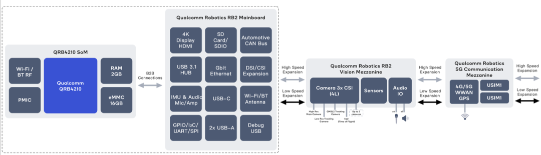 ◎ Qualcomm RB2:采用 Qualcomm QRB4210 ,适用于面向大众市场的各类机器人产品,能够满足日常机器人产品对于性能和功能的需求。核心架构为 Qualcomm® Kryo 260 CPU,由四个 2.0GHz 高性能核心与四个 1.8GHz 节能核心组成,实现速度与能效的平衡。搭载 Adreno™ 610 GPU,主频 950MHz,支持 64 位寻址和 FHD+ 显示,具备出色的图形与视频处理能力。在连接方面,内置 Qualcomm® FastConnect™ 6100,支持 Wi-Fi 6、蓝牙 5.1、WPA3 安全协议及数字 FM,提供更快、更稳定的无线体验。影像系统支持三路 ISP,可实现最高 25MP 拍摄和 1080p@60fps 视频处理。接口方面兼容 USB 3.1 Type-C、eMMC 5.1 和 SD3.0 标准,满足多样化应用需求。支持长期软件与硬件维护,计划延续至 2027 年。
