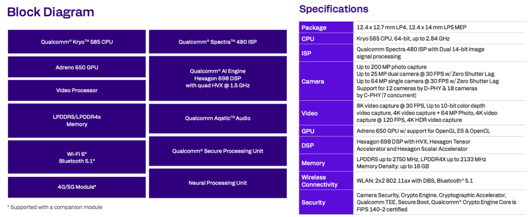 ◎ Qualcomm Dragonwing RB5:采用 Qualcomm QRB5165 , 是一款专为智能机器人和无人系统打造的高端平台。集成了 第五代 Qualcomm® AI Engine,具备高达 15 TOPS(万亿次运算/秒) 的 AI 算力,采用 7nm 工艺制造,配备 Kryo 585 八核 CPU、Adreno 650 GPU、以及 Hexagon 698 DSP(内含张量加速器与矢量扩展单元),构成强大的异构计算架构, Spectra 480 ISP 支持多达 7 路并发摄像头,可实现 8K 视频录制和 2 亿像素图像捕捉,为机器人视觉感知提供硬件支撑。QRB5165 还集成 EVA 视频分析引擎,可在低功耗下实现实时图像识别与决策,适用于协作机器人、商用无人机及自动配送设备等场景。同时支持 4G/5G 模块 和 Wi-Fi 6,提供高速低时延连接能力。芯片具备 -30℃ 至 105℃ 的工业级耐温特性,并配备 Secure Processing Unit (SPU) 安全子系统,确保数据与设备安全,预计可支持产品生命周期至 2035 年。◎ Qualcomm Dragonwing RB6:基于 Qualcomm QRB5165 + AI100 ,能够提供高效的计算和视频处理性能,适合用于需要强大 AI 处理能力的自主机器人,如智能巡检机器人、高端服务机器人等。