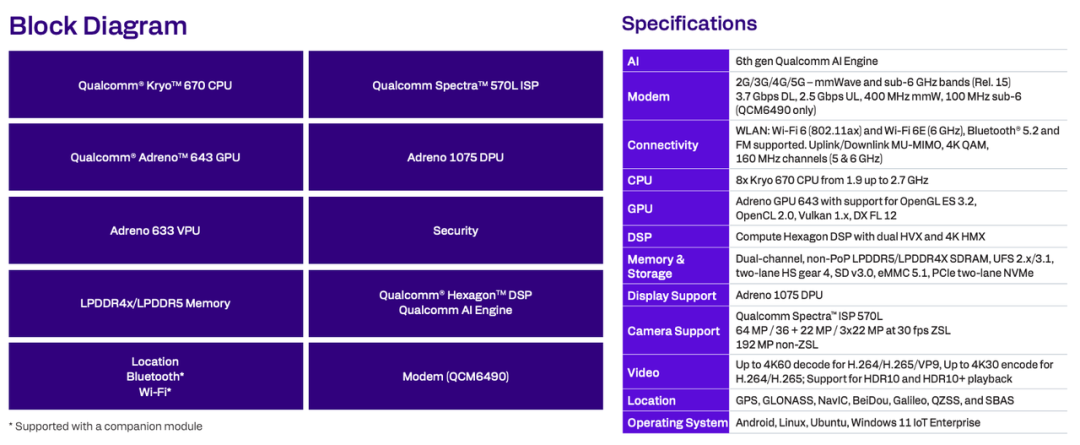 ◎ Qualcomm Dragonwing RB3 Gen 2:基于 Qualcomm QCS6490 ,是面向高计算要求的机器人平台,支持高性能计算和先进特性,可用于复杂任务的机器人,如科研、特种作业等领域的机器人。QCS6490/QCM6490 处理器基于 6nm 工艺 打造,集成 Kryo 670 八核 CPU(最高 2.7GHz)、Adreno 643 GPU 以及 第六代 Qualcomm® AI Engine,AI 算力高达 12 TOPS,在边缘端即可高效运行机器学习与计算机视觉任务。在连接方面,QCM6490 支持全球 5G(mmWave/Sub-6GHz) 网络,提供 3.7Gbps 下行与 2.5Gbps 上行速率;同时具备企业级 Wi-Fi 6E(6GHz) 与 蓝牙 5.2,可实现多千兆速率与极低时延,适用于高并发物联网场景。影像系统部分采用 三通道 Spectra 570L ISP,支持 5 路摄像头并行输入 与最高 4K60 视频处理,适用于工业相机、智慧零售、物流监控及人机交互终端等设备。芯片支持 Android、Linux、Ubuntu 与 Windows 11 IoT Enterprise 系统,生命周期延长至 2036 年,满足长期稳定供货与企业级安全需求。